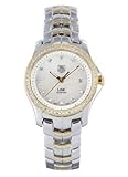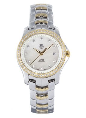 Make a bold, fashionable statement statement with this two-tone TAG Heuer Link timepiece for women (model WJF1354.BB0581), which offers glittering diamond accents. The stainless steel watch case measures 27mm wide (1.06 inches) and is topped by a gold-tone bezel that is completely ringed with 52 sparkling, tiny Wesselton diamonds. The mother-of-pearl dial is further accented with 11 more diamonds as well as luminous baton hands (with seconds hand) and a date window at 3 o'clock. It's matched to a stainless steel bracelet band composed of satin-finished S-shaped links. Other features include a precise Swiss quartz movement, highly scratch-resistant sapphire crystal, and water resistance to 200 meters (660 feet)--suitable for recreational scuba diving.