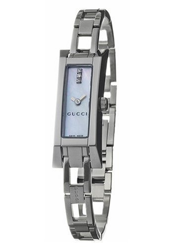 This Gucci Women's 110 Series watch brings style and luxury to any outfit you pair it with. Featuring a slender bracelet band, rectangular case, and bezel-- all made of stainless steel --this feminine timepiece displays a mother of pearl dial with silver-tone hands, the iconic Gucci just above six o'clock, and a glimmering index of 3 geniune diamonds at 12 o'clock. Also offering the reliable precision of Swiss quartz movement, a scratch-resistant sapphire window, and water resistance up to 99 feet, this dress watch is certain to see you through many momentous events.