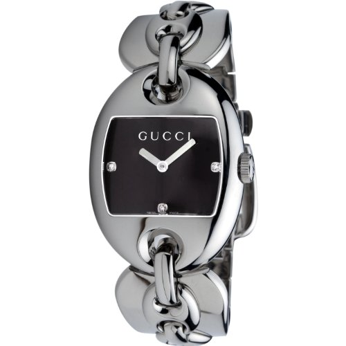 Stainless steel case with a stainless steel bracelet. Fixed bezel. Black dial with silver tone hands and diamond hour markers. Swiss quartz movement. Scratch resistant sapphire crystal. Fluted stainless steel crown. Solid case back. Case diameter: 32 mm. Case thickness: 10 mm. Jewelry clasp. Water resistant at 30 meters/ 100 feet. Functions: hours, minutes. Gucci Ladies Watch YA121303.