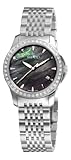 Stainless steel case and bracelet, Deployant clasp, Mother of pearl black dial, diamonds on the bezel, Luminous hands, Sweep second hand, Date window at the 4 o'clock position, Scratch resistant anti-reflection sapphire crystal, Swiss quartz movement, Water resistant to 30 meters/ 100 feet.