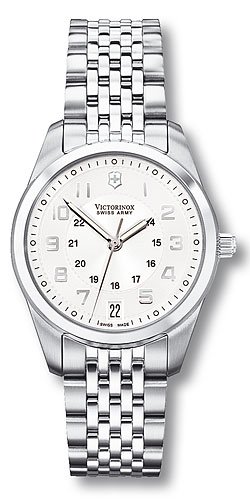 This Swiss Army stainless steel Ambassador lady's watch by Victorinox, with full numeral silver dial, sweep second hand, and date window, is automatic and has a stainless steel band. It has a skeleton back and is water resistant to 100 meters