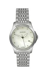 Stainless steel case with a stainless steel link bracelet. Fixed stainless steek bezel. Mother of pearl dial with luminous hands and diamond hour markers. The Cuggi name appears below the 12 o'clock positiom.. Luminiscent hands. Date disp;at appears at the 4 o'clock posituion. Quartz movement. Scratch resistant sapphire crystal. Push / pull crown. Solid case back. Case diameter: 27 mm. Case thickness: 7 mm. Deployment clasp. Water resistant at 50 meters/ 165 feet. Functions: hours, minutes, seconds, calendar. Gucci G-timeless Diamond Mother of Pearl Dial Ladies Watch YA126510.
